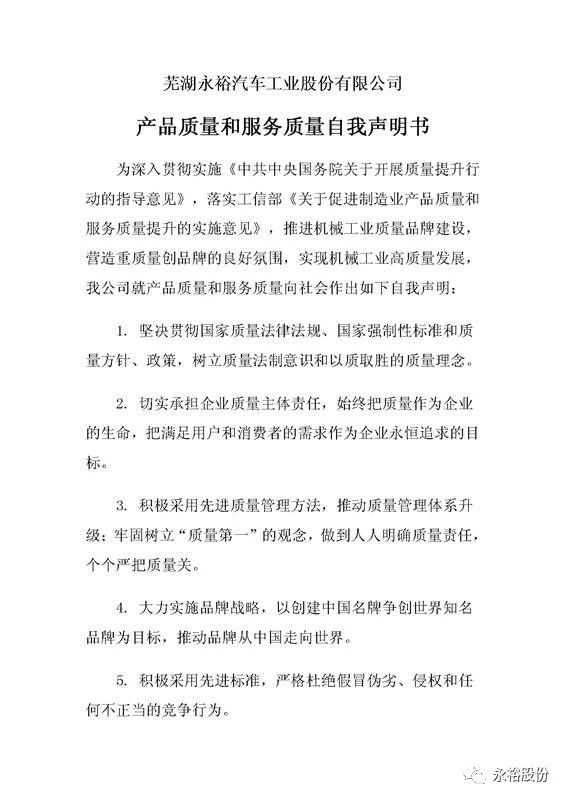 為深入貫徹實施《中共中央國務院關于開展質(zhì)量提升行動的指導意見》,落實工信部《關于促進制造業(yè)產(chǎn)品質(zhì)量和服務質(zhì)量提升的實施意見》,推進機械工業(yè)質(zhì)量品牌建設,營造重質(zhì)量創(chuàng)品牌的良好氛圍,實現(xiàn)機械工業(yè)高質(zhì)量發(fā)展,我公司就產(chǎn)品質(zhì)量和服務質(zhì)量向社會作出自我聲明.